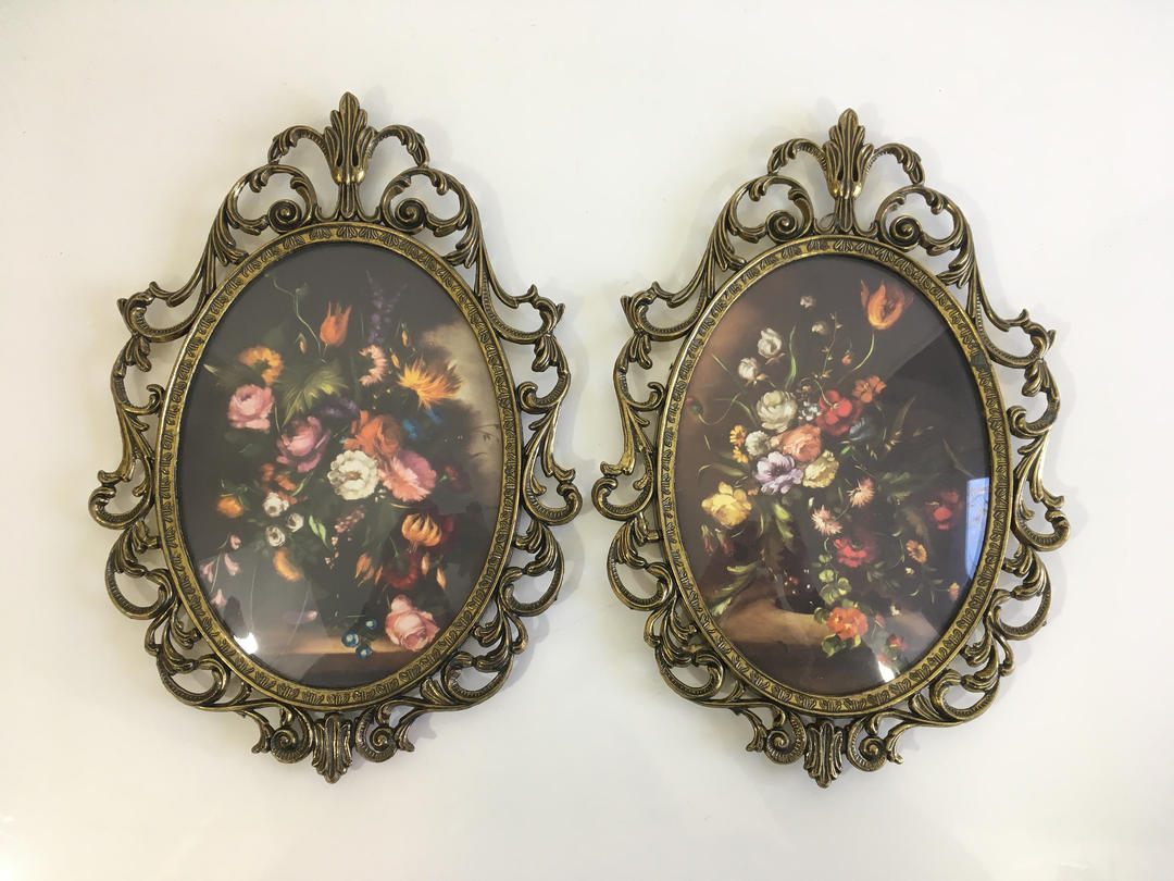 Floral flowers print oval metal scroll picture frame made italy vintage $20.0.